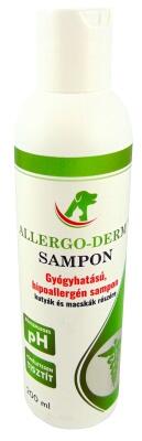 A termék összetétele (hatóanyagnál mennyiség is): Pirokton olamin: 0,5 g Sodium Coco-Glucoside Tartarate: 20,0 g Cocamidopropil betain: 13,3 g Sodium lauroyl sarcosinate: 1,0 g Hidrolizált Zabfehérje: 2,0 g Propilén-glikol /Benzil alkohol/Methylchloroisothiazolinone/Meth ylisothiazolinone: 0,125 g Aloe kivonat: 0,2 ml Körömvirág kivonat: 0,3 ml Deionizált víz ad: 100 ml Bőrsemleges pH Célállatfajok: Kutya és macska A termék felhasználási területének rövid leírása, felhasználási javaslat, javallatok: Az Allergo-Derm hipoallergén sampon kutyák és macskák bőrének zsírosodással, korpázással,  viszketéssel járó elváltozásainak megszüntetésére, illetve bőrgyógyászati megbetegedéseinek (pyoderma,  seborrhoea, folliculitis) kiegészítő kezelésére kifejlesztett termék. Alkalmazása ajánlott mindazokban az esetekben, amikor az allergiás, szeptikus bőrelváltozások kezelését előnyösen segíti egy kíméletesen tisztító, dezodoráló, bőrnyugtató samponos kezelés. Az Allergo-Derm sampon csökkenti a bőr irritációját, viszketését, előnyösen támogatja a sérült területek gyógyulását, elősegítve a bőr ökoszisztémájának helyreállítását, regenerációját. Adagolás és az alkalmazás módja: Az állat szőrét meleg vízzel meg kell nedvesíteni, majd az Allergo-Derm sampont el kell oszlatni a szőrön és a bőrön egyenletesen. Habképzés közben, masszírozva át kell mosni az egész testfelületet, majd le kell öblíteni. A samponozást meg kell ismételni, de a lemosás bő meleg vízzel, csak 5-10 perc elteltével történjen meg. Ha az állatorvos másképp nem rendeli, az alkalmazás első két hetében hetente 2-3 alkalommal később hetente egy alkalommal javasolt a használata. Ellenjavallatok: Nem alkalmazható a samponnal vagy egyes összetevőivel szembeni egyedi érzékenység esetén. Mellékhatások: Nem ismertek. Figyelmeztetések: Kizárólag külsőleg alkalmazható. Kerülni kell a termék szembe vagy hallójáratba kerülését.
