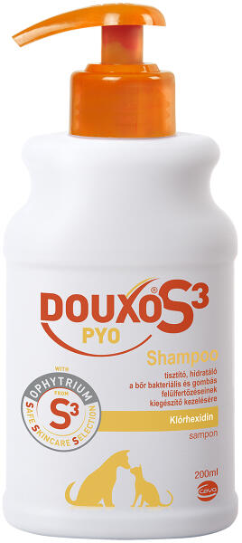 Az erős külső behatások következtében gyengül a kutyák és a macskák bőrének ökoszisztémája. A bőr barrier funkciója károsodik, a természetes bőrflóra egyensúlya felborul, a bőr védekező mechanizmusai aktiválódnak, ami összességében bőrirritációhoz vezethet. - Szappan-, szulfát-, parabén-, színezék- és nanorészecske MENTES. - Hipoallergén illatanyag, beállított pH. Állatorvos-bőrgyógyász szakemberek által kifejlesztett és tesztelt. A DOUXO® S3 kulcs összetevője az OPHYTRIUMAz Ophytrium természetes eredetű, nagy hatékonyságú és jól tolerált S3 – Safe Skincare Selection (biztonságos bőrápolásra kiválasztott) – összetevő, mely hármas hatással rendelkezik:- Erősíti a bőr mechanikus barrier funkcióját, ezáltal hozzájárul a rugalmas és tartósan hidratált bőr megőrzéséhez, - Segít fenntartani a bőr normál mikrobiális flórájának egyensúlyát, ami az egészséges bőr védelméhez nélkülözhetetlen, - Csillapítja az irritációt, ezáltal megnyugtatja a bőrt. Alkalmazás és adagolás :KÜLSŐLEGES ALKALMAZÁSRA. Az állat szőrzetét langyos vízzel át kell nedvesíteni, majd a felvitt sampont mélyen be kell masszírozni a szőrzetbe az állat egész testfelületén. Kerülni kell a szemek környékét! A hatás eléréséhez 5-10 percet várni kell a hab leöblítése előtt. Az alkalmazás szükség szerint megismételhető. Egy nyomásnyi mennyiség kb. 2 ttkg-ra elegendő. Hosszú és/vagy sűrű szőrzet esetén dupla adag javasolt. Az ophytrium és a klórhexidin-diglükonát rendszeres és hosszantartó hatása érdekében használjon DOUXO® S3 Pyo Habot. Összetétel : Ophytrium, klórhexidin-diglükonát 3% (CAS18472-51-0), B5-vitamin (pantenol), pentavitin, kímélő tisztító formula, hipoallergén illatanyag.
