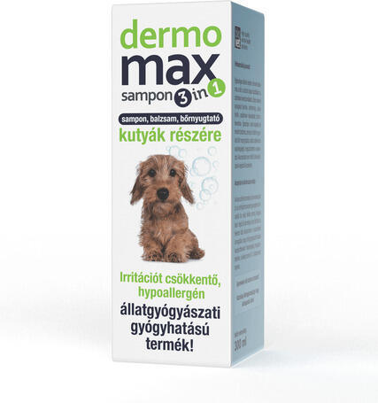 A Dermomax sampon 3 in 1 egy hipoallergén, bőrnyugtató hatású sampon és balzsam. Egészséges állatok esetén a termék alkalmas a bőr, a szőrzet alapos tisztítására, a szőrtakaró kondicionálására. Olyan növényi anyagokat (kamilla-, körömvirág-, cickafarkfű-, csalánlevél-kivonatokat, citrom-, levendula-, ligetszépe-, teafa olajokat) és mentolt tartalmaz, amely az irritált és gyulladt bőrt megnyugtatja, ezáltal csökkenti a viszketegséget, megszüntetheti a vakarózást. Alkalmazható nem fertőző bőrelváltozások kiegészítő kezelésére.
