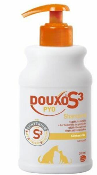 A DOUXO® S3 Pyo Sampon egy tisztító sampon kutyák és macskák számára, melyet a 3%-os klórhexidin-diglükonát tartalma miatt alkalmaznak a bőr bakteriális és gombás felülfertőzéseinek kiegészítő kezelésére. A klórhexidin-diglükonátnak köszönhetően segít helyreállítani a bőr mikroflórájának egyensúlyát, és tisztítja a bőrt. A sampon hidratáló és kifésülést könnyítő hatással is rendelkezik, puhává és fényessé teszi a szőrzetet. A DOUXO® S3 Pyo Sampon szappan-, szulfát-, parabén-, színezék- és nanorészecske-mentes. Hipoallergén illatanyaggal rendelkezik, és beállított pH-jának köszönhetően kíméletes az állat bőréhez. Az ophytrium, a klórhexidin-diglükonát, valamint a többi összetevő együttműködése biztosítja a termék hatékonyságát. Alkalmazás és adagolás: