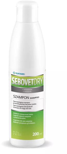 Eurowet Sebovet száraz sampon 200ml - Termékleírás A Sebovet - Dry egy kifejezetten korpásodás tüneteit mutató kutyák és macskák mosására alkalmas állatorvosi dermokozmetikum. A samponban található hatóanyagok támogatják a felhám megfelelő állapotát, növelik a bőr rugalmasságát és enyhítik a bőrirritációval járó tüneteket. Eurowet Sebovet száraz sampon 200ml - Műszaki adatok